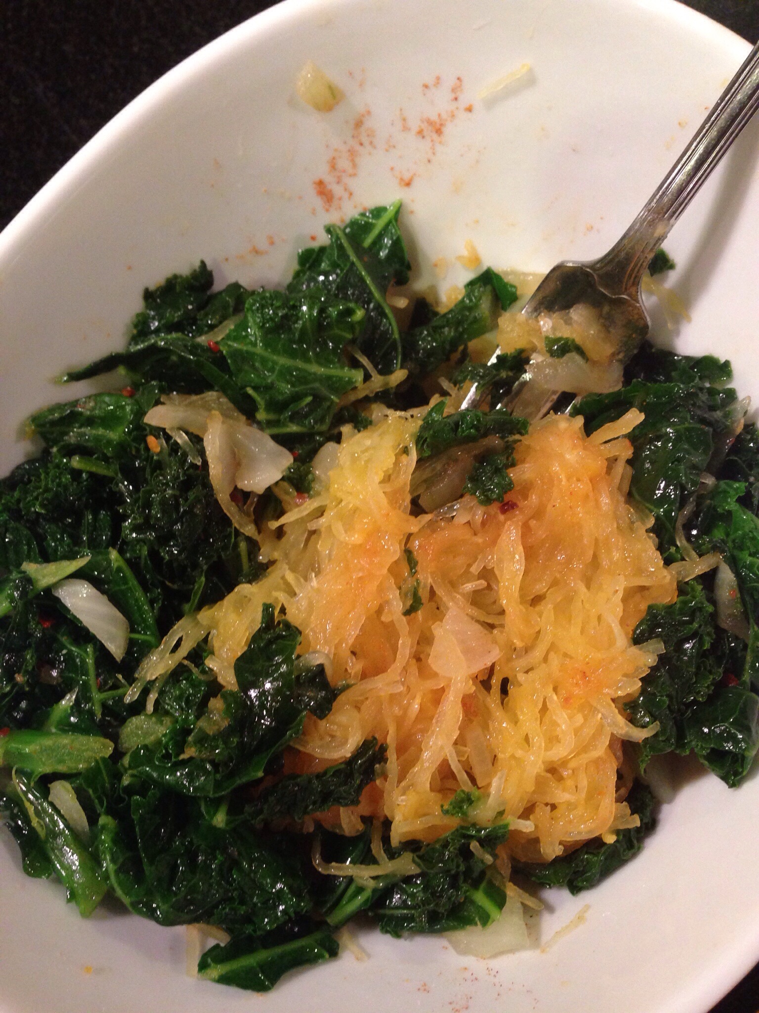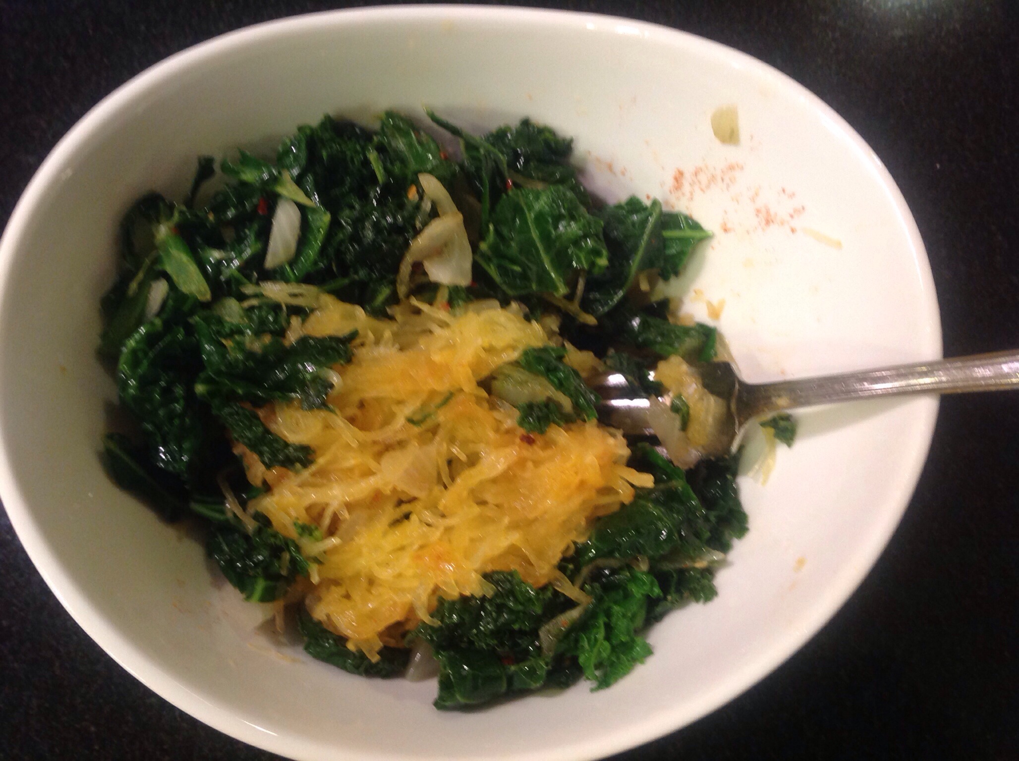 Thanks to The Pioneer Woman on Pinterest, tonight I stuffed my face with Roasted Spaghetti Squash with Kale! Why didn’t someone tell me about spaghetti squash? I feel like I’ve been missing out in life. Geez! The dish was da bomb! Like I was sucking the juice from the kale from the bottom of the bowl. B’Dazzle came down stairs, spotted me and asked, “Is it good?” I felt kinda silly doing exactly what I tell him not to do– put the bowl to the mouth and soup the remains out. Haa! Haa!! Oh well, mom has her weak moments too.