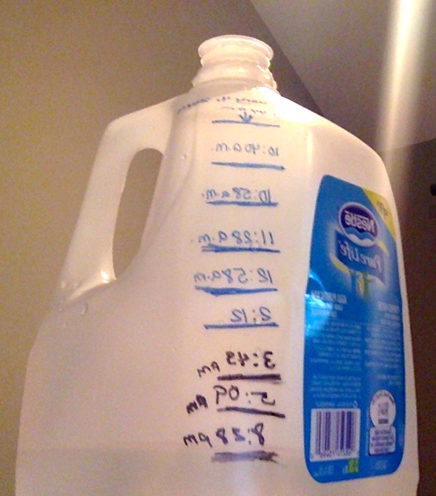I am stretched out in the bed now, resting my achy muscles and trying to finish today’s one gallon water bottle. I started out strong at work, but then slowed down around 5 p.m.