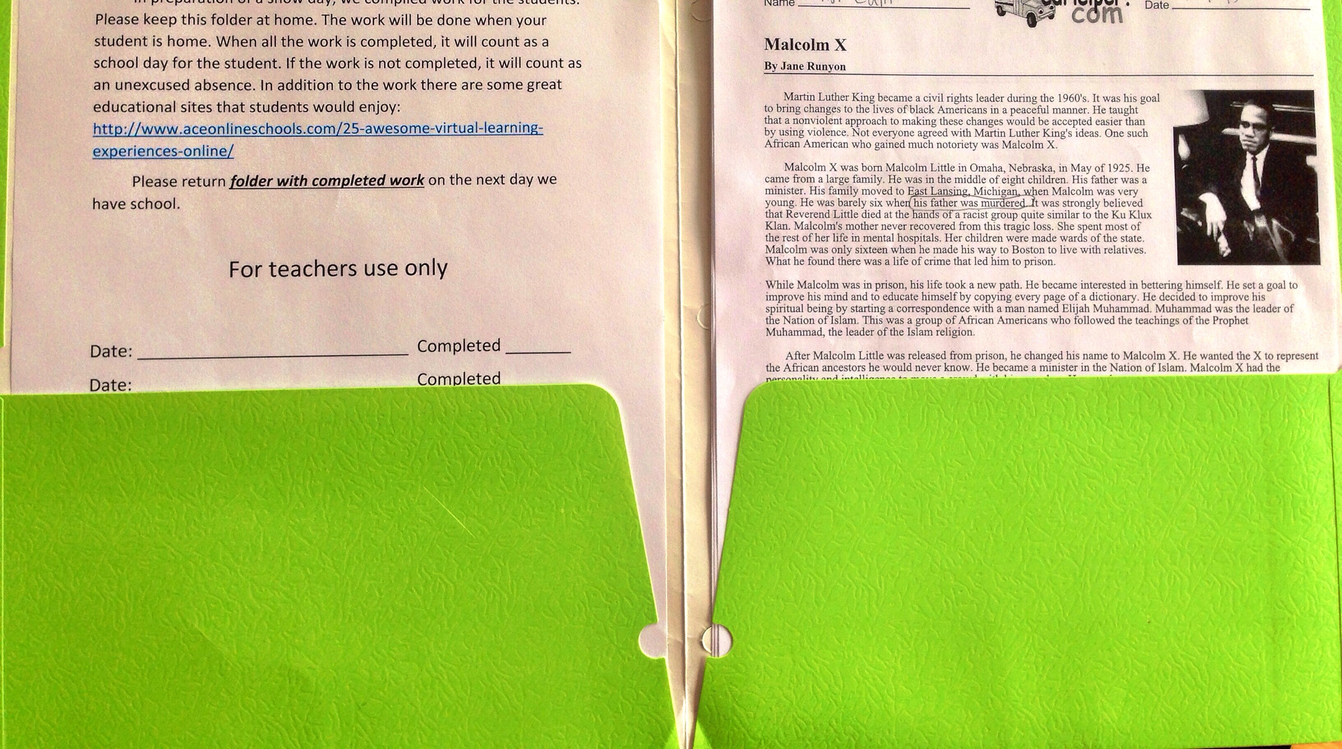 The folder contains reading, writing and math assignments. When school is closed due to inclement weather, students are expected to complete the assignment. The absence is only excused, when the student completes and submits the work the next day of school. The idea is to make sure that students are productive on their unscheduled day off from school.