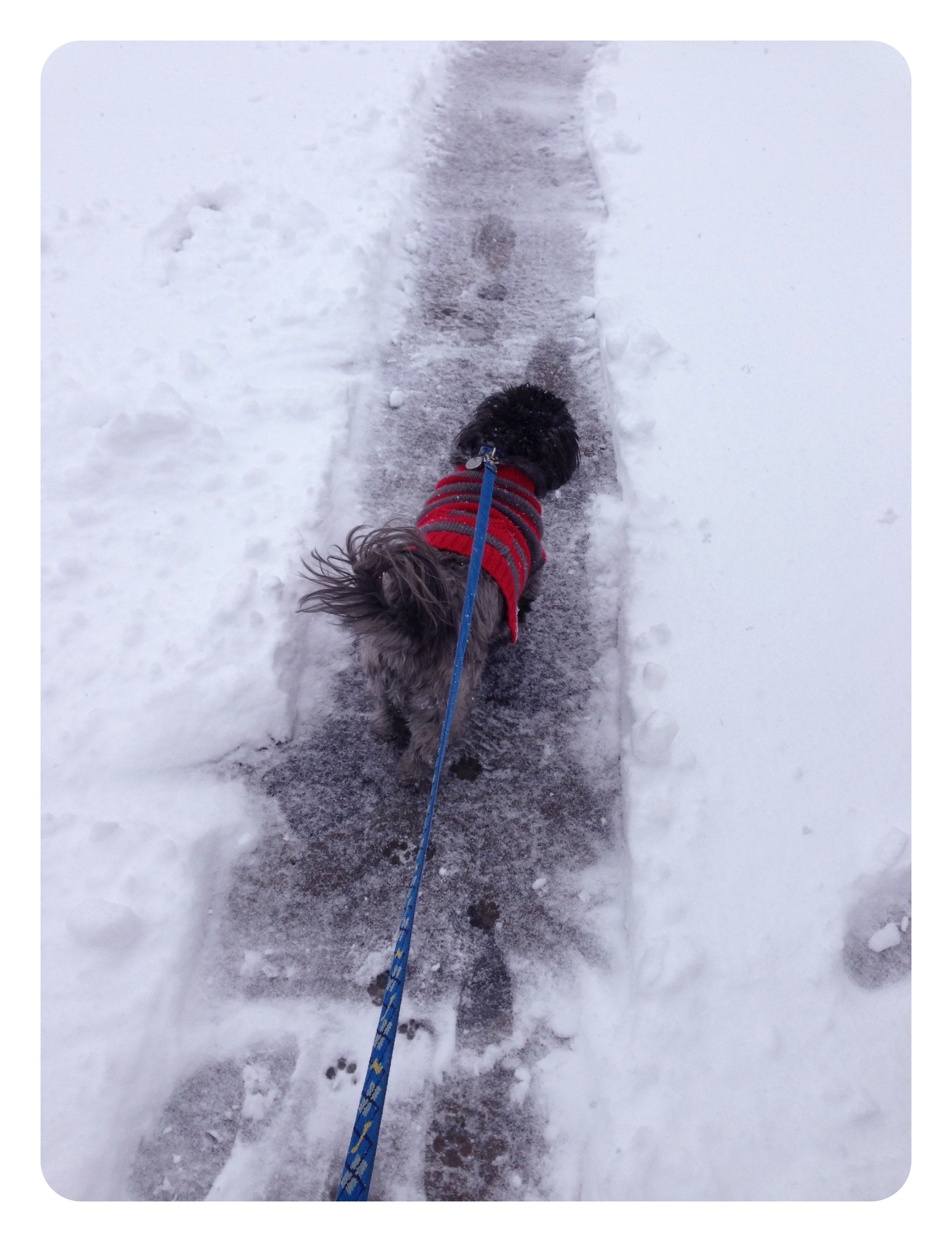 Before heading out to the gym, I shoveled a path for our pooch to go potty. He’s not the smallest of the Shih Tzu breed, but small enough that his four paws sink through deeper snow and land him face down in it.