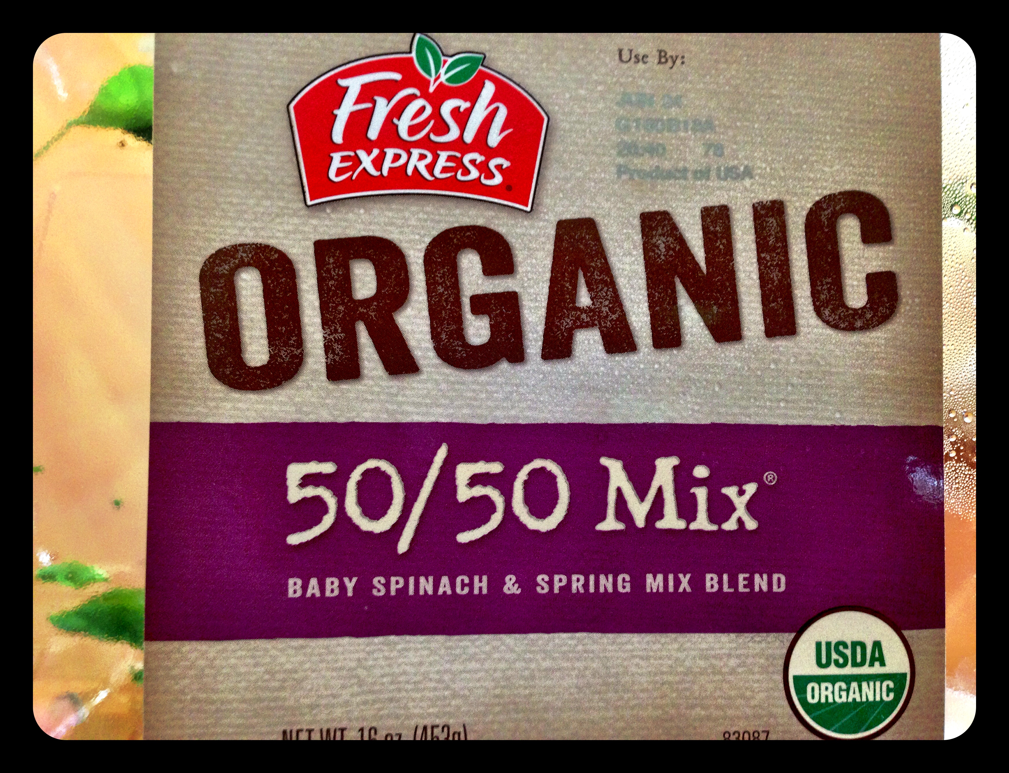 A ginormous hand full of UNCOOKED USDA Certified Organic 50/50 Mix of baby spinach & spring mix blend. If you keep baby spinach or a blend of green veggies like this on hand, you’ll never have to stress over the unavailability of cooked veggies. Tossing them in the microwave for two minutes with a little pan drippings is perfect.