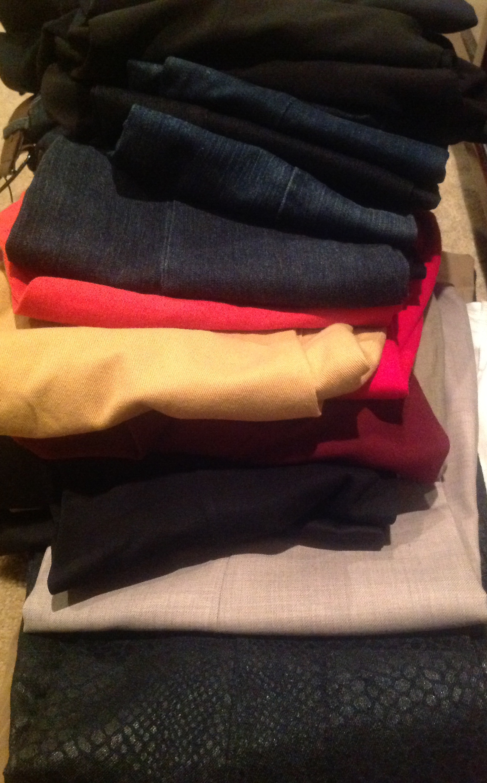 This pile makes me want to cry! I’m not a brand name person, but here lies beautiful designer suits and dresses. It would cost more to pay for alterations than to buy new ones. Sheesh!!