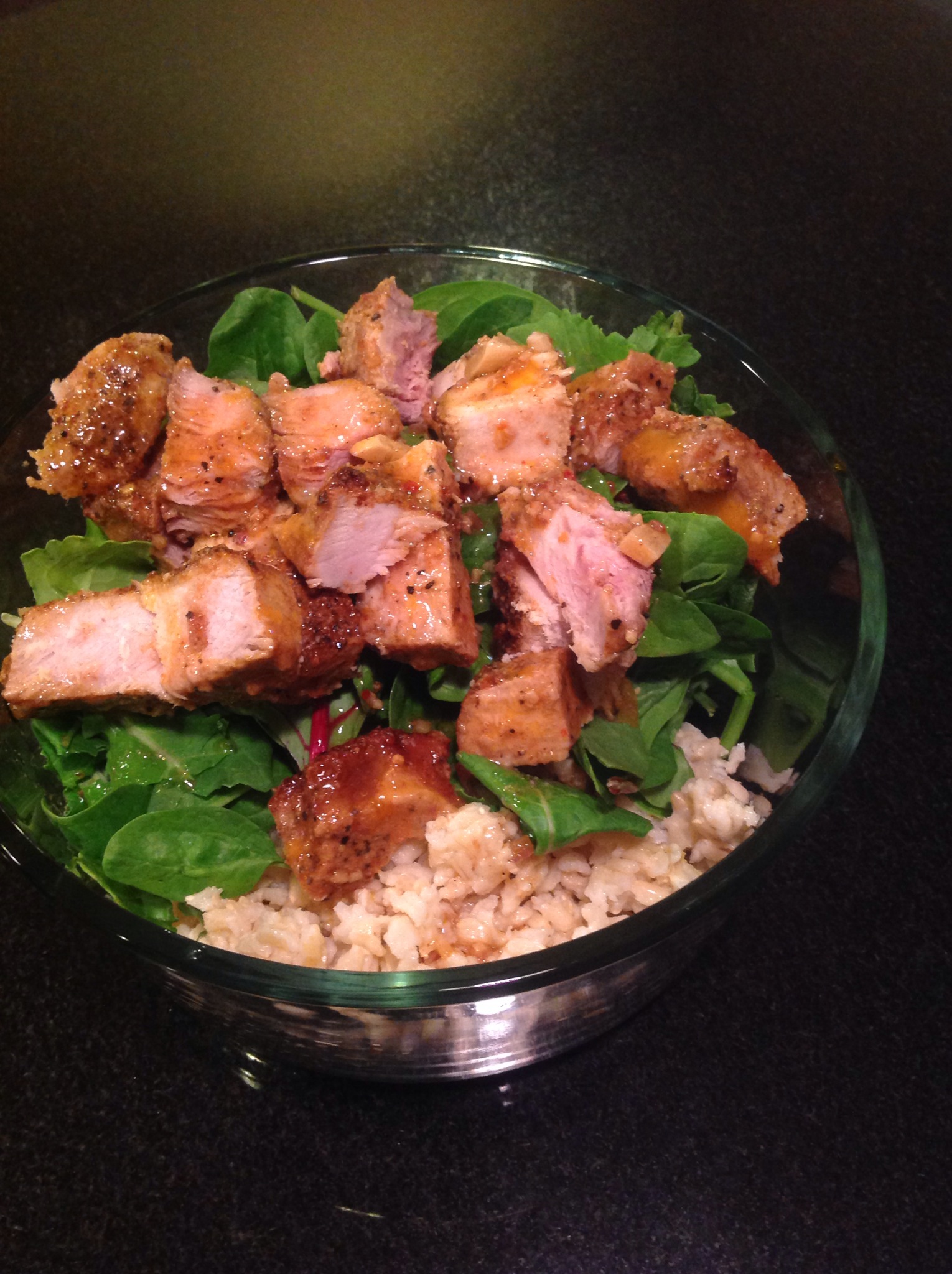 Anyways, the meat is from Sunday’s food prep session; center cut pork loin. We ate the last of the cooked veggies yesterday, so I tossed in a couple handfuls of a kale medley blend (spinach, kale, chard, and carrots), drizzled pan juices from the cooked chops, and placed the chops on top. A half-cup of brown rice is my side.