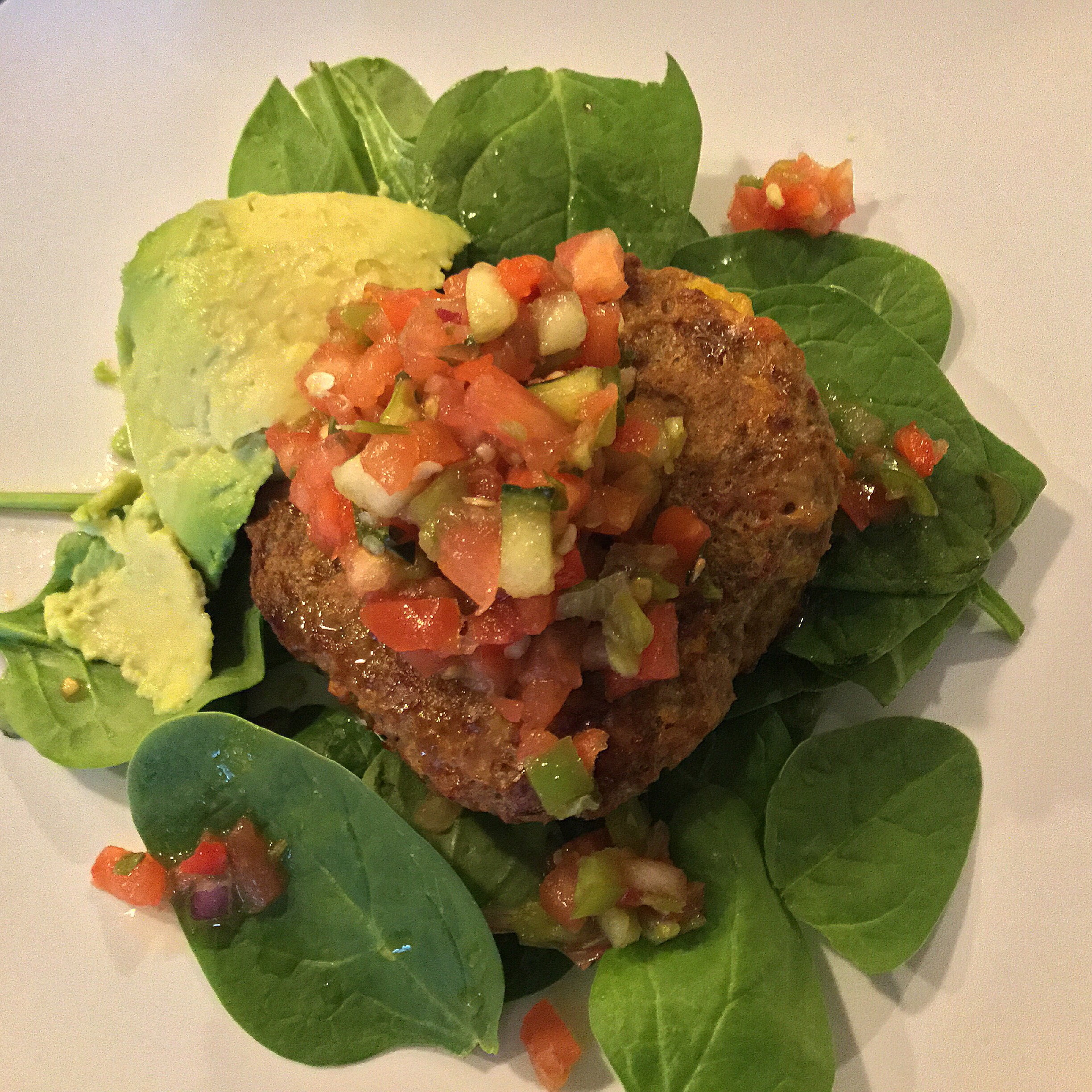 Place the burger on a bed of baby leaf spinach, add a half of an avocado and top it with fresh hot salsa! Oh man!! That was delicious. I could have also made a guacamole dip to put on the burger, but I was in a hurry! I took a spin class this morning and was due for my meal. 🙂
