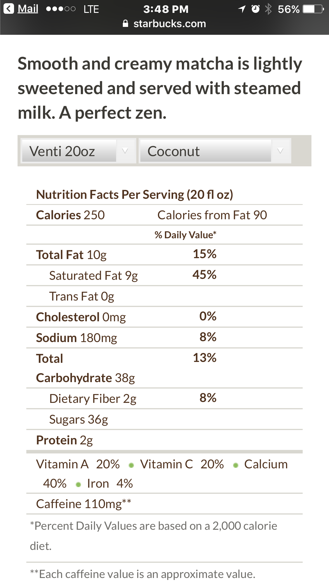 The Venti is loaded with even more sugar! 36 grams!! This is ridiculous. Starbucks has to do better. They got that one off on me. This is yet another example of why we have to stay diligent in researching all that we eat and drink. 250 Calories. 9 grams of saturated fat. 90 calories from fat. When I read the label, I became sad and angry. Who would think green tea would have so much sugar? Yup. They tricked me.