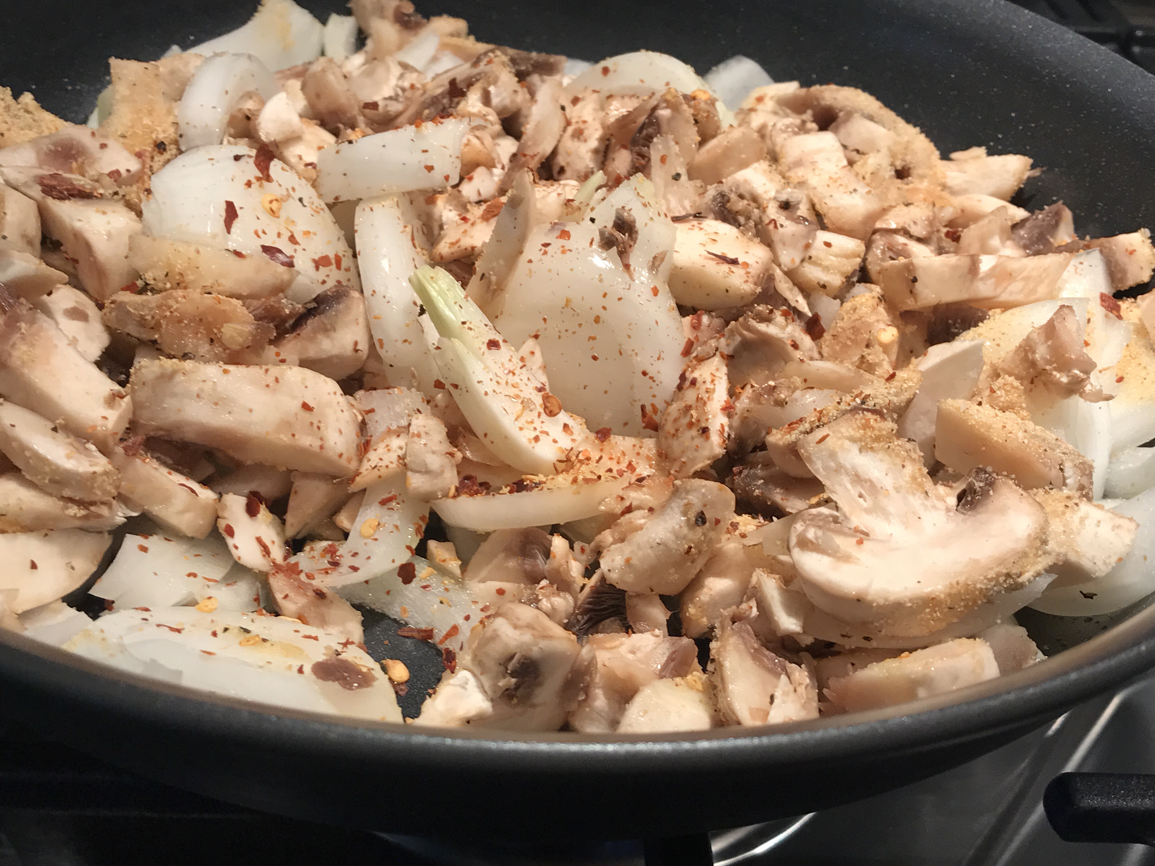 Mushrooms, sweet onions, freshly ground black pepper, garlic powder, crushed red peppers, and olive oil sautéed in a pan.