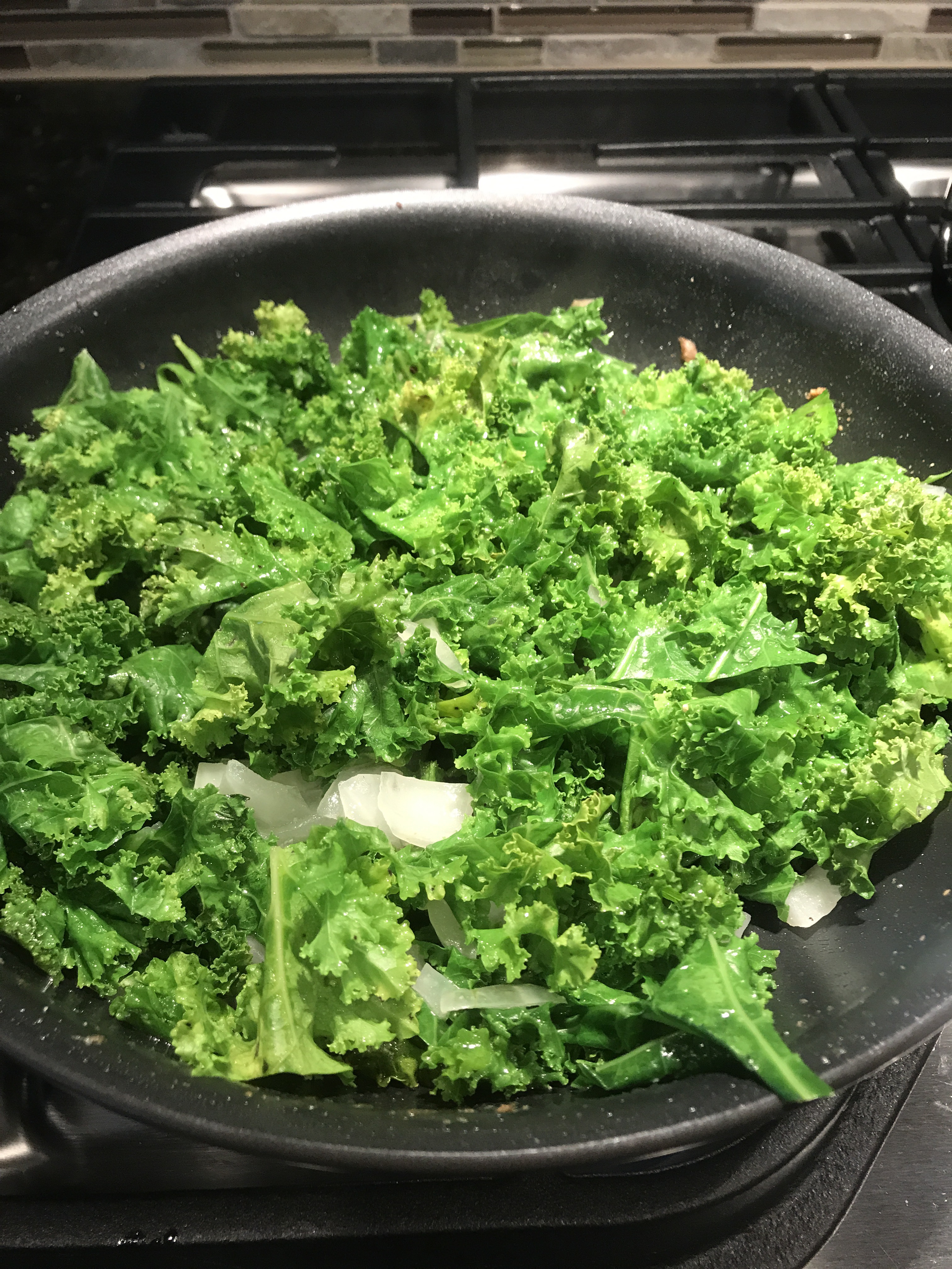 I planned to make a kale salad, so I had a bunch of kale already cleaned in the fridge. I grabbed two handfuls and tossed them in a pan with onions. Sprinkled with the same seasoning, except the Cheyenne pepper, they cooked for less than 10 minutes.