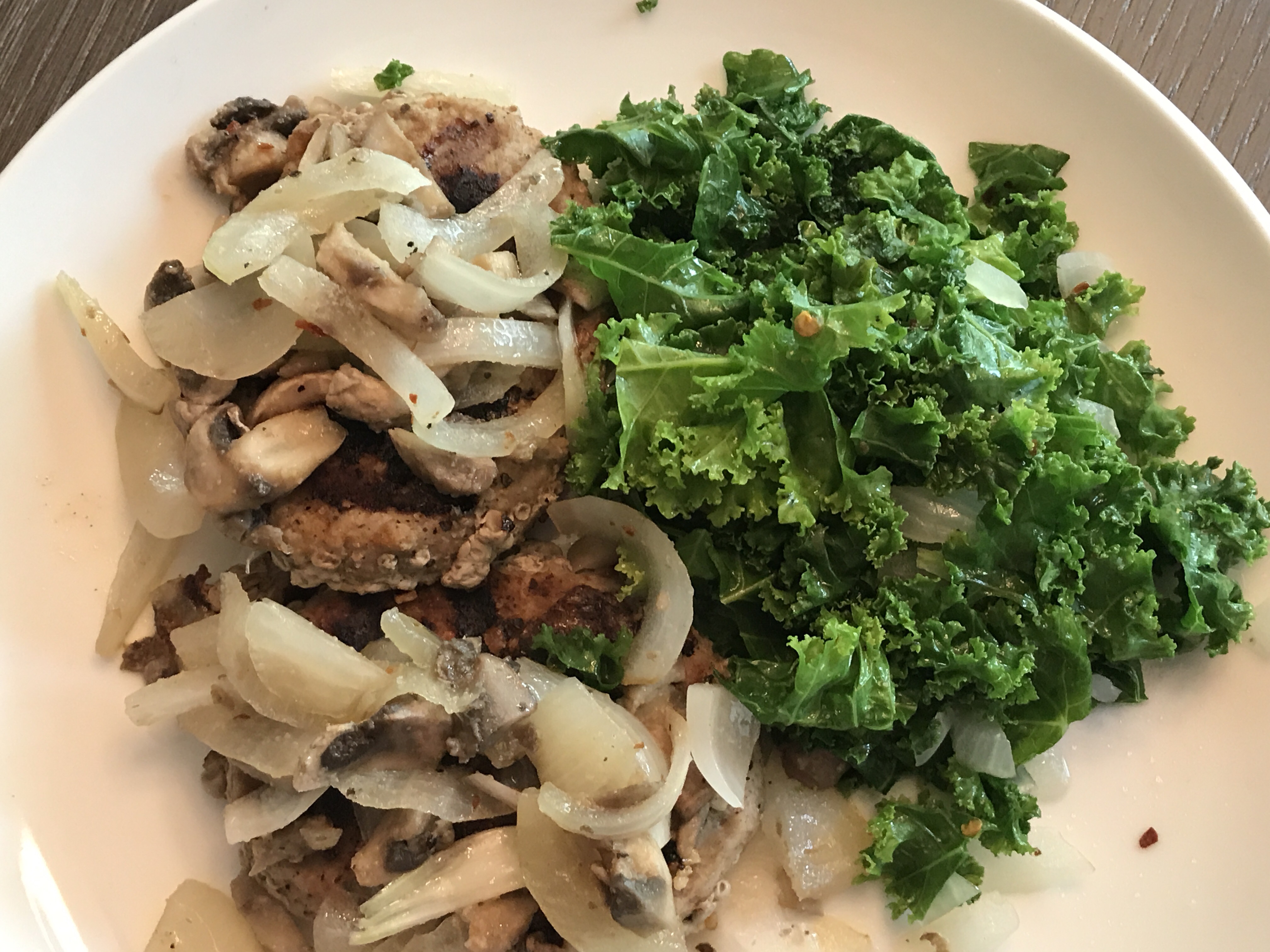 Finished product- two turkey patties smothered with mushrooms and Vidalia onions (no gravy, sauce or additional condiments needed), next to freshly sautéed kale.